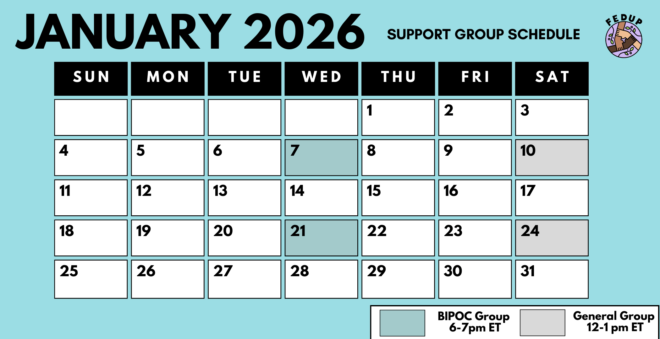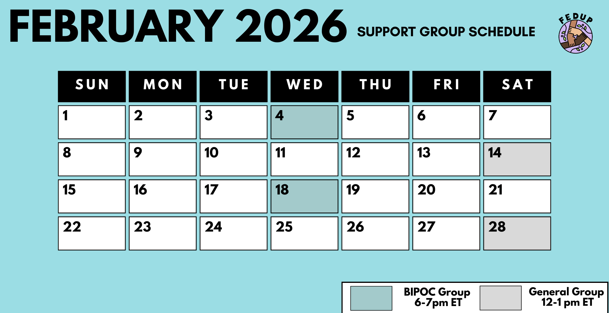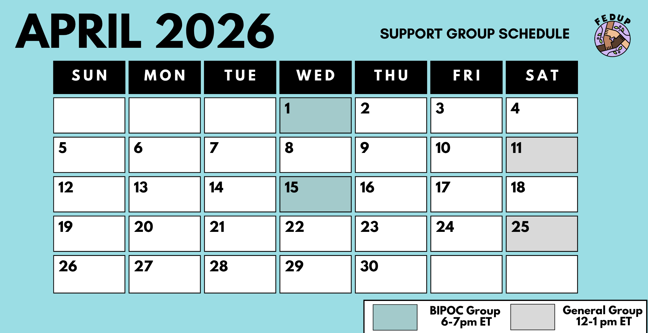 Starting in May 2023, FEDUP decided to suspend support group offerings in order to improve groups' structure and guidelines and expand the training for the support group facilitators. The team has and continues to work diligently to implement measures that create a safe and supportive space for both group members and support group facilitators.